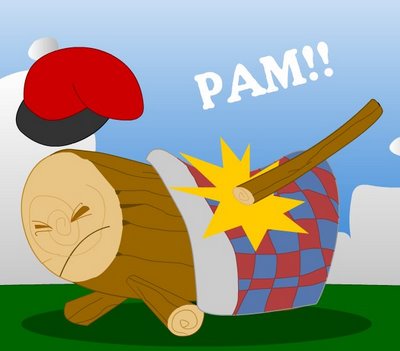 -“Oh! Un tió! Faré llenya”- va exclamar el pastoret. En alçar la destral va sentir una veu que li deia: -“Ai, ai, ai, que em faràs mal! Sóc el Tió!”-